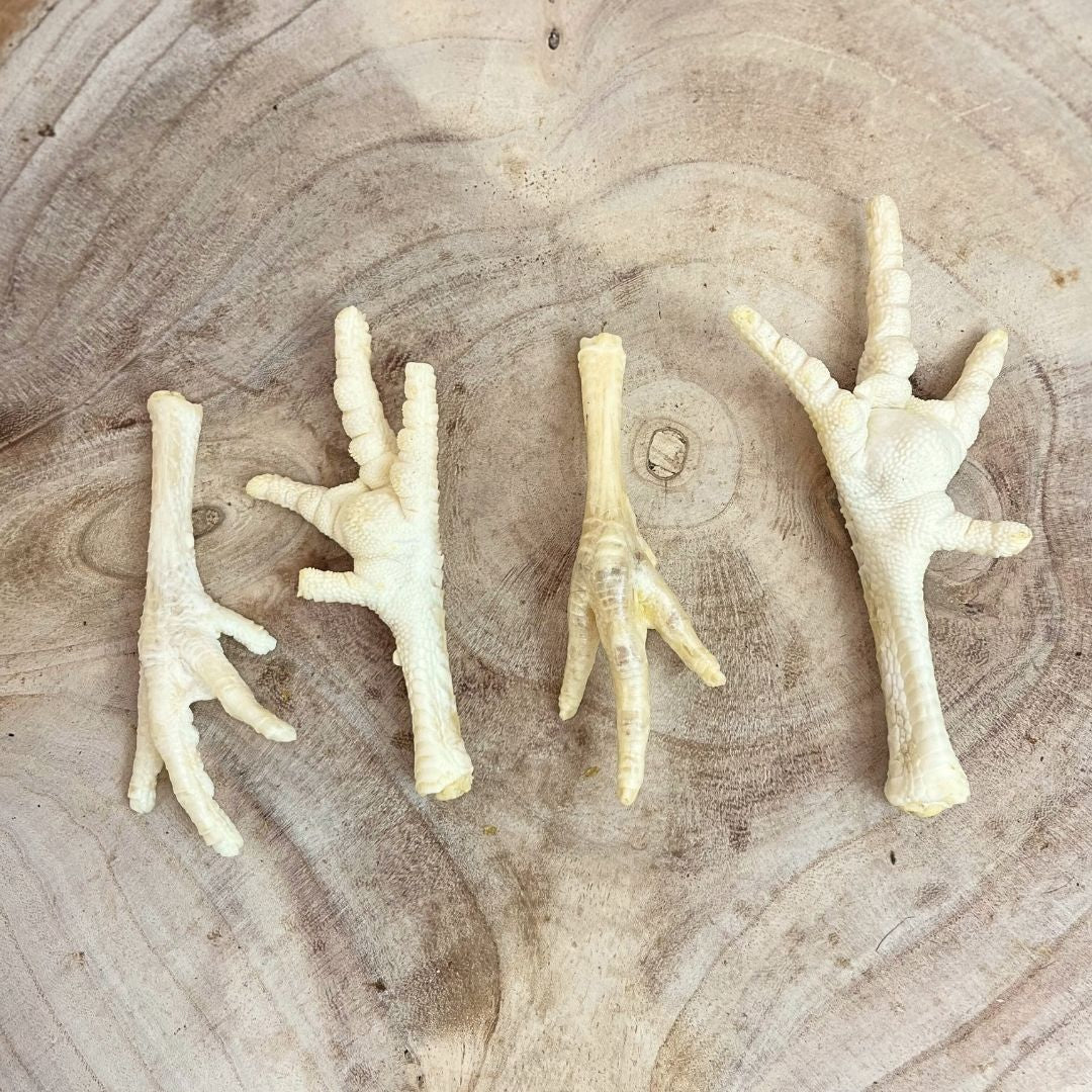 Chicken feet are high in collagen which is great for promoting healthy skin, coat and joints in dogs. They are also good for promoting healthy teeth and gums, when the dog chews the chicken foot it scrapes away the tartar and plaque.
